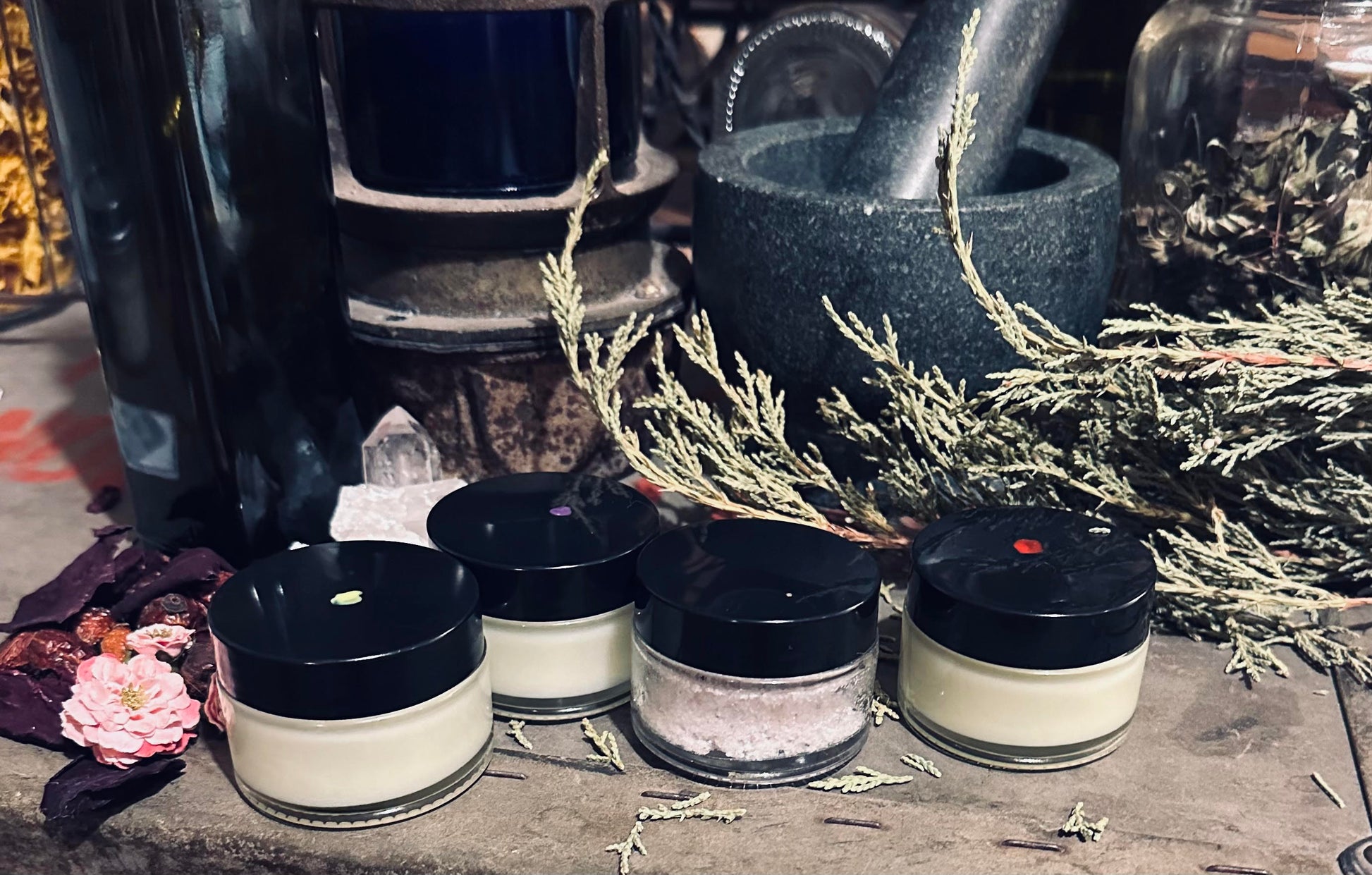 Rose oil, coconut oil, olive oil, lavender oil, mint oil, eucalyptus oil, rosemary oil —naturally and ethically sourced. Made in small batches with care and intent for your health.